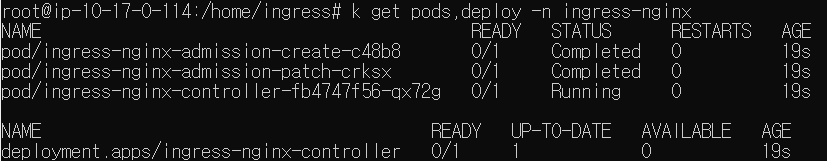 "ingress-nginx" 네임스페이스로 생성된 포드, 디플로이먼트 확인